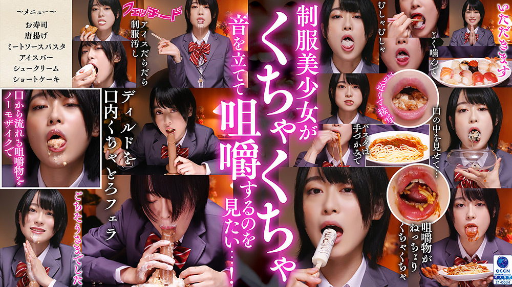 制服美少女がご飯を食べている時の口の中が見てみたい…。制服姿のそらちゃんが、くちゃくちゃ音を立てて咀嚼、その口を開けて、咀嚼した物を器に吐き出す。お寿司を食べている時のくちゃくちゃ、唐揚げを食べる時のむしゃむしゃ音、どれも近くでじっくり見せてくれます。パスタは手づかみで口に入れ、ちゅるちゅるくちゃくちゃ音を立ててよく噛んでから咀嚼物を吐き出し。アイスを食べた後は口を開けて制服にタラ~ッと垂れ流し…。シュークリームとショートケーキを咀嚼して口の中で優しく温め、そのままディルドをくちゃとろフェラ。クリームとケーキがぐちゃぐちゃに混ざった咀嚼物をボトボト垂らしながらのフェラをノーモザイクで最後までじっくり堪能してください…!