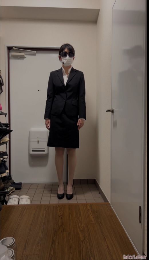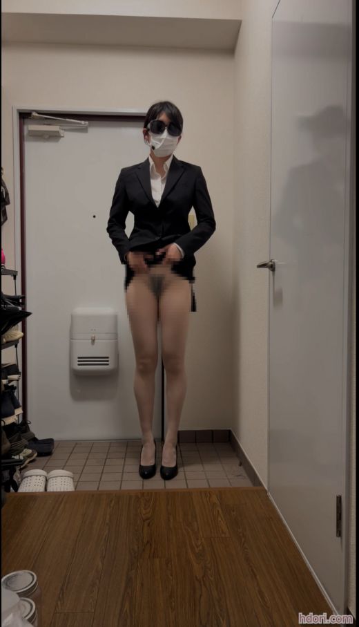 場所は玄関。衣装はリクルートスカートスーツ。 ベージュのパンスト直穿き。 ハイヒール。 「今日はこの格好で仕事に行きます」 スカートをめくり。 「ほら、ノーパンパンスト!」 「おまんこにパンスト食い込んでる」 スーツを全部脱いで。パンストだけになり。「本当はこの格好で仕事に行きたい!」「ノーパンパンストだよ!」「ほら、おまんこみえる?」「大丈夫?こんな格好で仕事して大丈夫?」と、パンストを引っ張り上げてパンストを食い込ませてオナニー。あとはアドリブで淫語を連発しながらいっちゃう。11分51秒