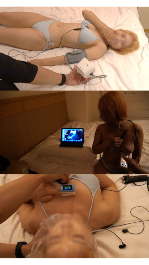 閲覧いただきありがとうございます。りこさん30才の心音動画1です。身長153センチ体重43キロと低身長かつ小柄な方でした。普段からジムやピラティスをして運動されているだけあって体も細身で、また金髪ボブヘアでギャルっぽい雰囲気のエロ可愛い容姿をされております。しかし性格はご自分でもマイペースと言われているほどおっとりとされており話し方もおしとやかで言葉遣いも丁寧で容姿と性格とのギャップが素敵な方でした。今回りこさんの方から興味を持っていただき撮影させていただきました。りこさんのように心臓フェチに興味を持ってくださる方がいてうれしい限りですね。内容は・自己紹介と心臓の音・自分の心臓の音を聞いた時の反応と心臓の音・スクワットしたときの心臓の音・踏み台昇降したときの心臓の音・各種血圧と心臓の音・心エコーと心臓の音・運動後の心エコーと心臓の音・袋呼吸しながら運動したときの心臓の音・胸を揉まれたときの心臓の音・一人でエッチな行為をしてるときの心臓の音となっております。動画の長さは51分32秒となっております。初めに自己紹介をしていただいてから聴診器を左胸辺りに当てていただき座った状態の平常時の心臓の音を聞かせていただいております。お胸の大きい方でしたが心臓の音はしっかりと聞こえており、緊張はされているそうですが心拍数は66BPMと鼓動は比較的ゆっくりめです。りこさんの心臓も持ち主に似ておっとりなんですね。聴診器の位置を下乳の辺りにも当てていただくと、「ドックン、ドックン」と心尖部が一拍一拍、拍動しているのが良く聞こえ直接耳を胸に当てているかのような感覚になります。途中で「なぜこの撮影を受けようと思ったのですか?」などの心臓に関する質問もいくつかしております。次にりこさんにもご自分の心臓の音を聞いていただきました。おもちゃの聴診器で自分の心臓の音を聞いたことはあるそうなのですが本物を使って聞いたのは初めてだそうで、もちろん本物の方が良く聞こえるようでまた自分の心臓の音を聞きながら「ペッコペッコって感じです。」と可愛い効果音で心臓の音をあらわしておりました。途中で心尖部辺りにも聴診器を当てて聞いていただくと「なんか深みがあります。」と音の違いが、りこさんにも分かったようです。頸動脈に触れていただきながら心臓の音を聞いていただくと「頸動脈の方が速い気がします。」「でも一緒か、、、」「いや頸動脈の方が速い気がします。」と一人で混乱されており見ててほほえましかったです。お水を飲んでいただくと鼓動が速くそして大きくなっており「おーめっちゃ速い!」と鼓動が速くなることに驚いておりました。最後に深呼吸もしていただきました。りこさんの心臓も吸ったときと吐いた時では鼓動の速さが少し変わっており良い感じに洞性不整脈が出ておりました。続いてスクワットをしていただき心臓の音の変化を聞いていただきました。一回一回しっかりと負荷をかけておこなっていただいており、ゆっくりなりこさんの心臓も徐々にスピードをあげております。始める前の鼓動がゆっくりだった分、変化も分かりやすくまた一拍一拍の拍動する力が強くなって言ってるのか鼓動がすごく大きくもなっていっております。「すごい、速くなってる!」とご自分の心臓がここまで速くなることにびっくりしており、スクワットを初めて2分経過する頃には91BPM平常時ぁ�罎戮凸世蕕�に心臓も音が速くなってます。「バックンバックンバックン」と激しく弁が開閉しているのが心音からも分かそんな小さい体で大丈夫?と心配しちゃうくらいですね。「終わった後の方が速い!」と言われており、頸動脈にも触れて平常時との違いを感じていただきました。最後に深呼吸をして鼓動が落ち着くまで収録しております。スクワットの次は踏み台昇降ももちろんしてもらいました。普段から運動されているりこさんには、きつそうな踏み台昇降も許容範囲と言うことで平気そうですが、鼓動は徐々にバクバクとスクワットの時よりも速くなっていっており最終的に100BPMまで上がっております。平気そうにしていても心臓は正直ですね。鼓動が落ち着いた後もスクワットの時よりも一拍一拍の拍動が強くもう弁が勢いよく開閉しているのが心音から伝わってきます。胸に手を当てていただくと「おっきく動いているような感覚です!」と言われております。深呼吸をしていただくと多少落ち着いてきており、最後にベッドに座って体を休めていただくと「さらにゆっくりになった気がします。」と言われておりました。各種血圧と心臓の音では、初めに横になって安静しているときの血圧を測っております。運動をされているから血圧も健康そうかと思いきやめちゃめちゃ低くてビビりました。上の血圧は90を下回っており下なんかは60を切ってしまってます。これはもう明らかな低血圧です。女性の平均とご自分の血圧を見ていただくと「なんか低い