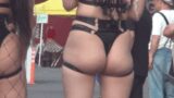ふわりと舞うミニスカート、その奥からのぞいたのは…黒のTバック。肉感的なヒップにぴったりと密着した布面積の少なすぎる黒のショーツが、肌を際立たせるという衝撃…。動くたびにさらに深く食い込み、わずかな隙間から浮かび上がる柔らかな肌とのコントラストが刺激的。