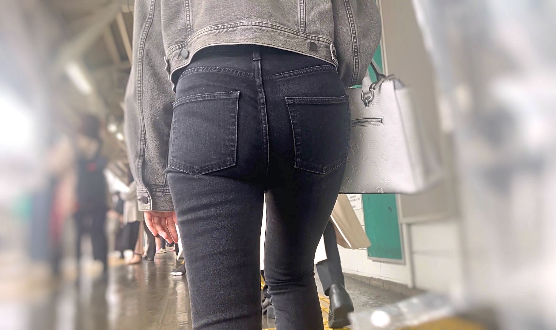 階段では苦しそうに尻肉がパッツン+ムニュりつつ、人気のエスカレーターシーンでは下からの見上げ接写でお触りしたい衝動がマックスに。