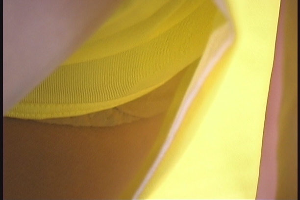 お次は見所の黄色ミニスカギャル!とっても童顔で可愛らしいお顔!黄色の見せパンお尻側横から食み出る白の生パンツ!パンツのゴム感もハッキリ判るハミ出方!