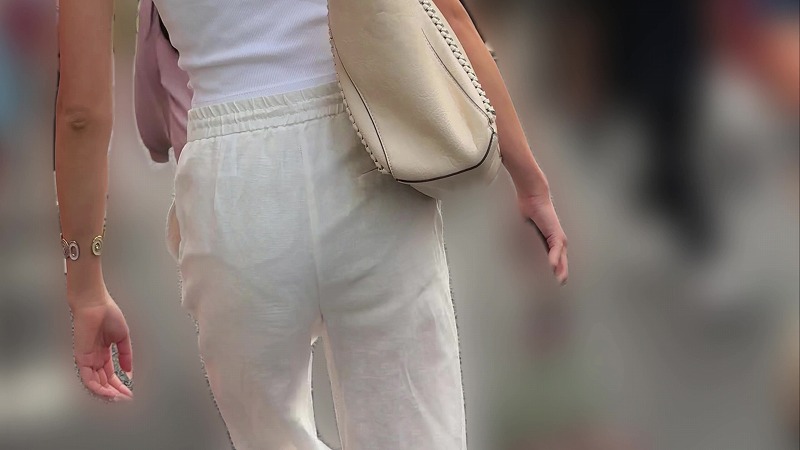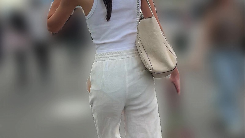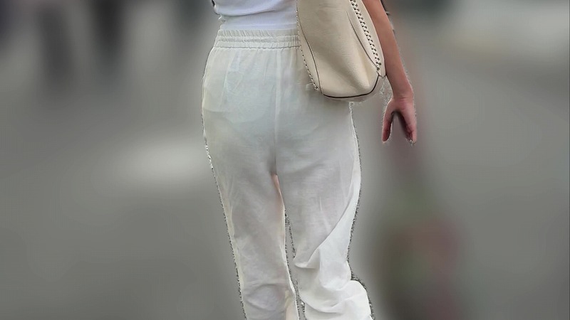 テロテロの白いズボンから意識低目なフルバックのパンティーが透け透けに透けています。