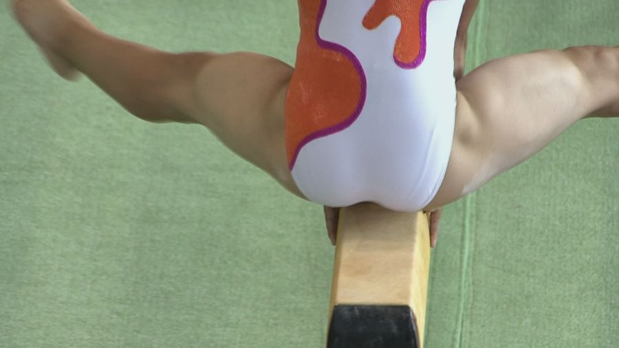5分20秒 まずはロイター板を使って平均台にまたがり、開脚から倒立です。開脚しやすいように、ハイレグのレオタードをチョイスしているので、しっかり食い込みが確認できます。