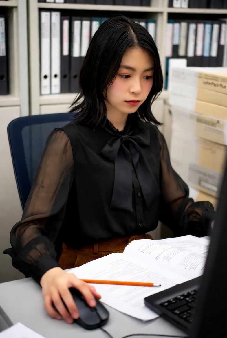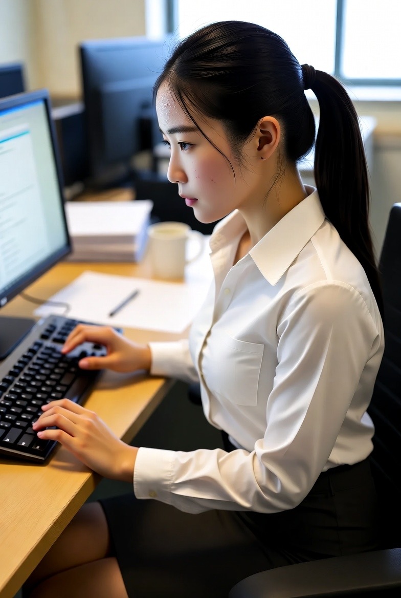 彼女の黒髪がサラサラ揺れて、オフィスカジュアルがピッタリ張り付く感じが超リアル。ゆっくりズームインしながら、丸みのあるおっぱい柔らかさを堪能…。彼女の表情が集中から驚き、そして笑顔に変わる瞬間がたまらないの〜! 布地の伸びや肌の紅潮、影の立体感まで細かく再現して、まるで本物のオフィスでイタズラしてるみたい♡
