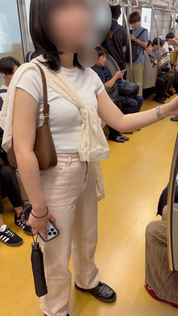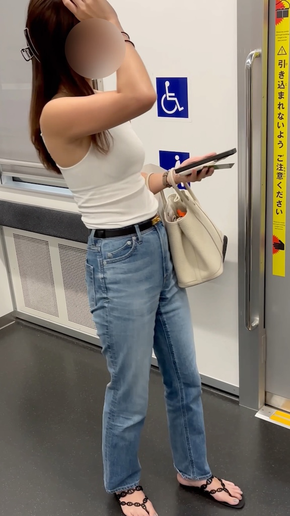 ノースリーブタイプのニットワンピース姿でお出かけ。