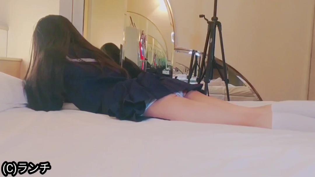 01:56〜03:58 うつ伏せになり撮影です。長い黒髪の美少女。セーラー服姿の美しい後ろ姿。スカートから伸びる細い太もも。脚の間から見えるパンチラ。途中でスカートを捲ってもらいお尻部分のパンモロ。最高です。