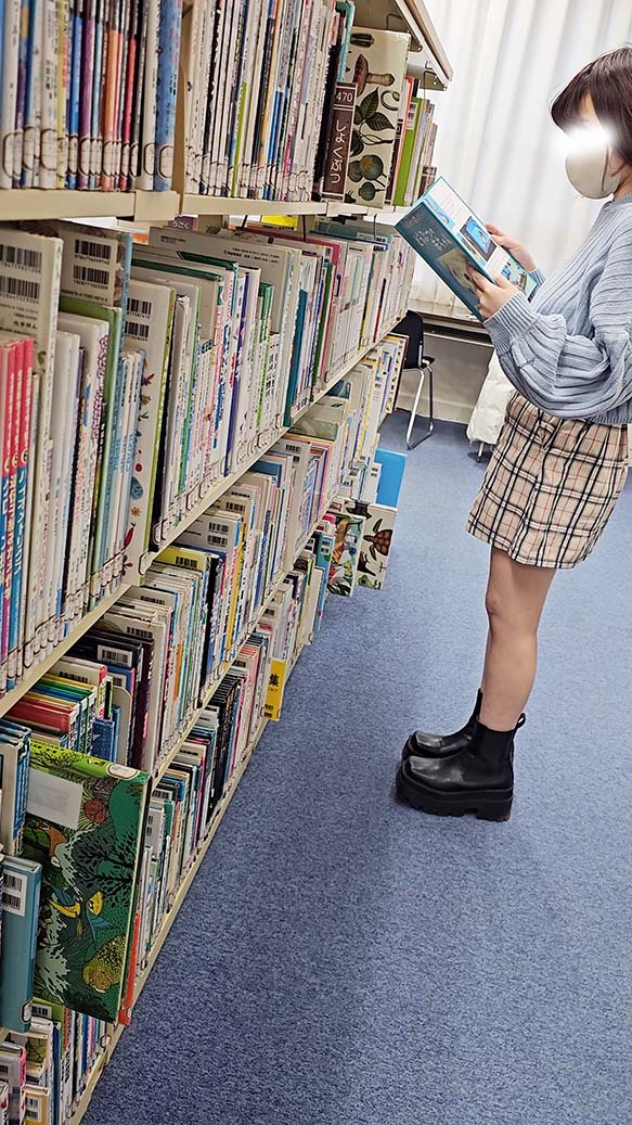 この娘のショート丈セーター激やばです。正面から見てもさほどおかしいとは思わなかったのですが、棚上にある本を取ろうとしたときに可愛いこのおっぱいが露わに、、。