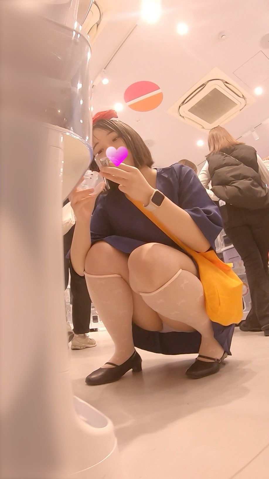 ガチャガチャコーナーではしゃがみ、背後からの逆さ、普段はなかなかチャンスのないフロント、さらには捲りまで頂きフルコースを堪能。フロント撮影時にはPのフロントに可愛らしい小さなリボンを発見、お尻とは違う表情を見せてくれてます。最後の方はガチャガチャに疲れたのかコーナーの隅にしゃがみ込み髪型を直したり、お友達と連絡を取り合ってるのでしょうかスマホをイジイジ。もちろんその間も絶賛М字開脚中、そしてモッコリ白P丸見えです…