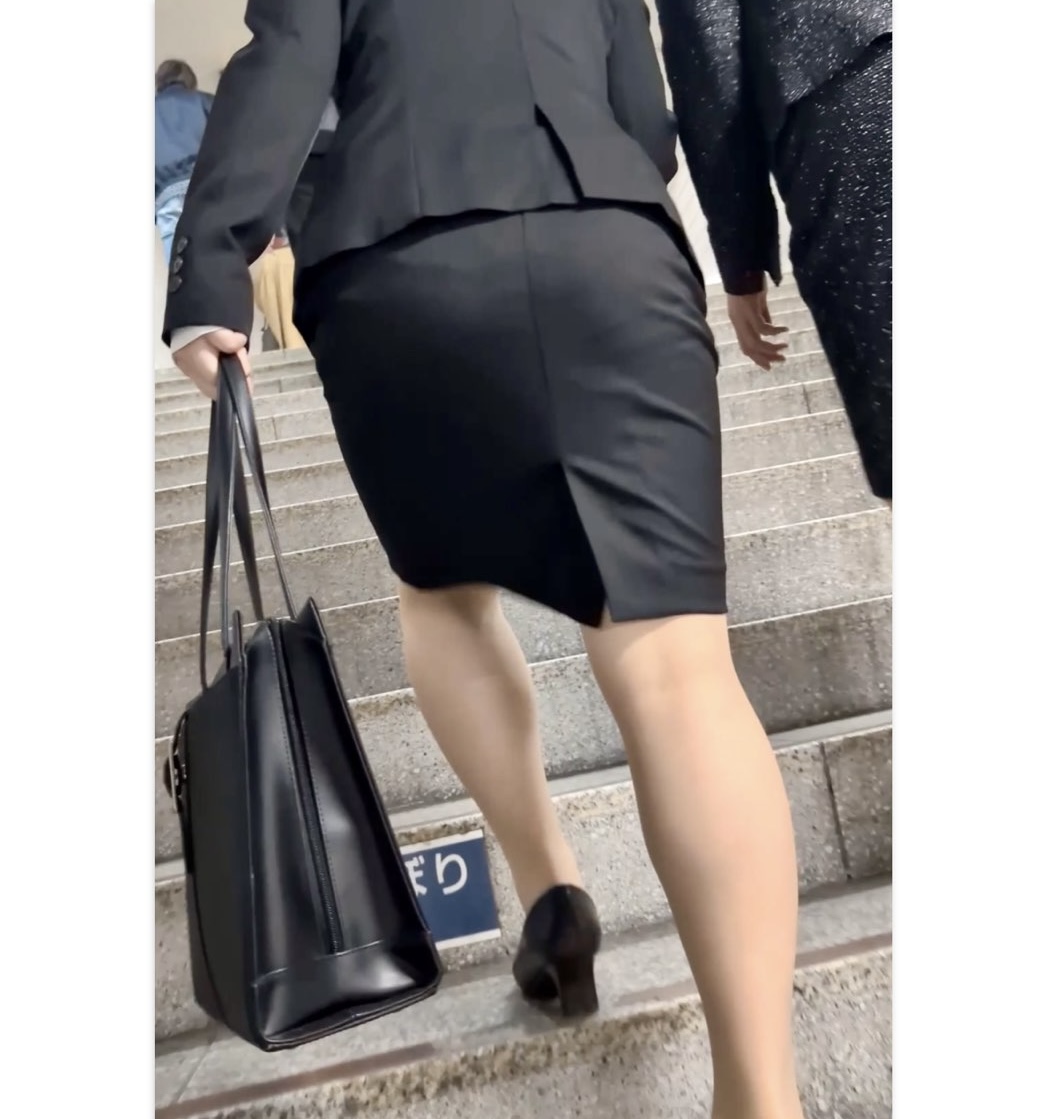 1人目はすてきなブラックのフォーマルなスーツ…。しかも強力なお尻のボリュームです。タイトスカートの張り具合に見惚れてしまいます。