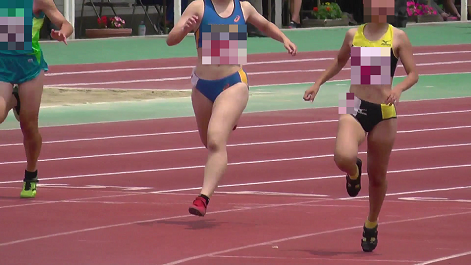 100短はゴール付近からの撮影なのでスタートは正面斜め前から。ゴールシーンも前から捉えています。スタート地点には出番に備えて多くの選手がいます。全身カットで上から下までじっくり観れます。
