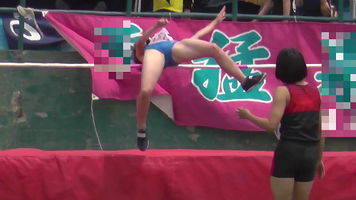 走高跳は後方から撮影。後方から撮影は結構珍しい画角では。セパレートのウェアの後姿をじっくりと長い時間観られます。ルーティンの様子やインターバルなど緊張感があります。