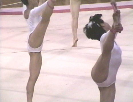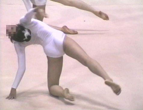 ボール、フープ、ロープ、リボンなどの手具を使っています。珍しいのはタンバリンを叩きながらの団体演技。音が出るので難易度は高そうです。発表会だけにカラフルで大胆なデザインのレオタードが多数登場。いつもながら白のレオタードには目を見張ります。透過度も良い感じです。フロアーでの撮影のため迫力のあるアングルです。